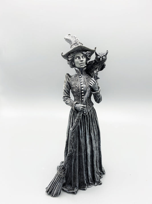 Victorian Witch Statue, Hand Painted Resin Sculpture | Gothic Victorian Folklore Figurine | Pagan Witch with Familiars Spooky Home Decor