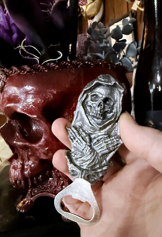 Santa Muerte Bottle Opener, Hand Painted Resin | Gothic Skull Art Barware, Grim Reaper Bottle Opener | Fantasy Gothic Beer and Barware Gift