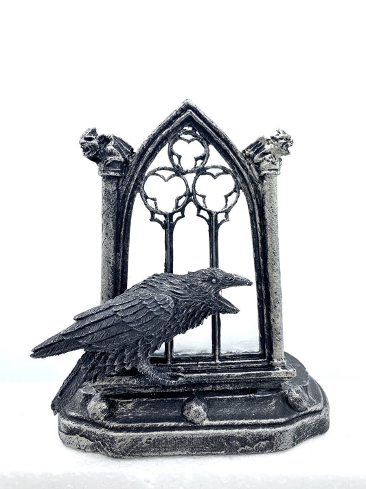 Raven and Window Tea Light, Hand Painted Resin Sculpture | Medieval Gothic Night Light | Poe’s Raven Lighting for Gothic Fantasy Home Decor
