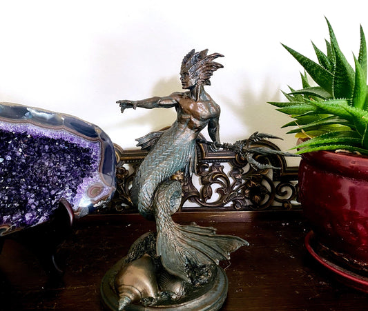 Merman/ Triton Statue, Hand Painted Resin Sculpture | Mythical Creature Figurine | Unique Legendary Male Mermaid Figurine. Fantasy Art Decor