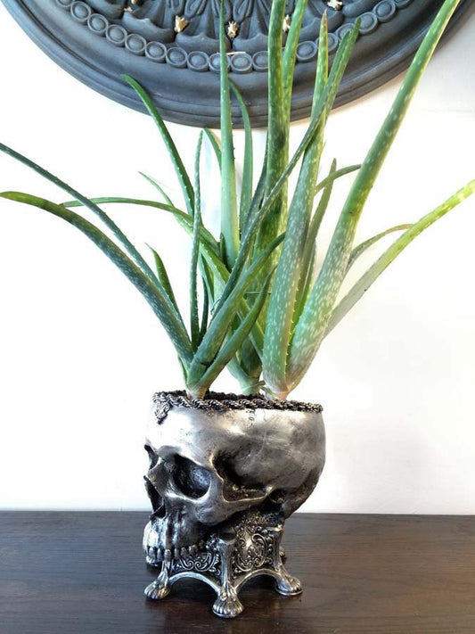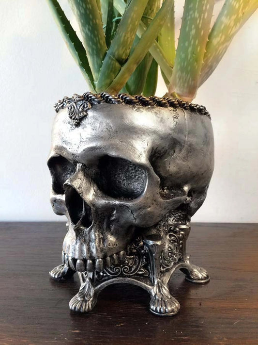 Human Skull Planter Pewter Finish, Hand Painted Resin Sculpture | Unique Gothic Home Decor | Spooky Art Gift and Gothic Home Decor