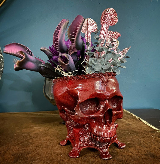 Human Skull Planter Blood Red Finish, Hand Painted Resin Sculpture | Unique Gothic Home Decor | Spooky Art Gift and Gothic Home Decor