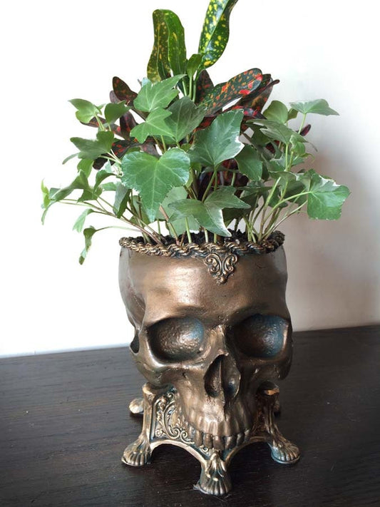 Human Skull Planter Bronze Finish, Hand Painted Resin Sculpture | Unique Gothic Home Decor | Spooky Art Gift and Gothic Home Decor