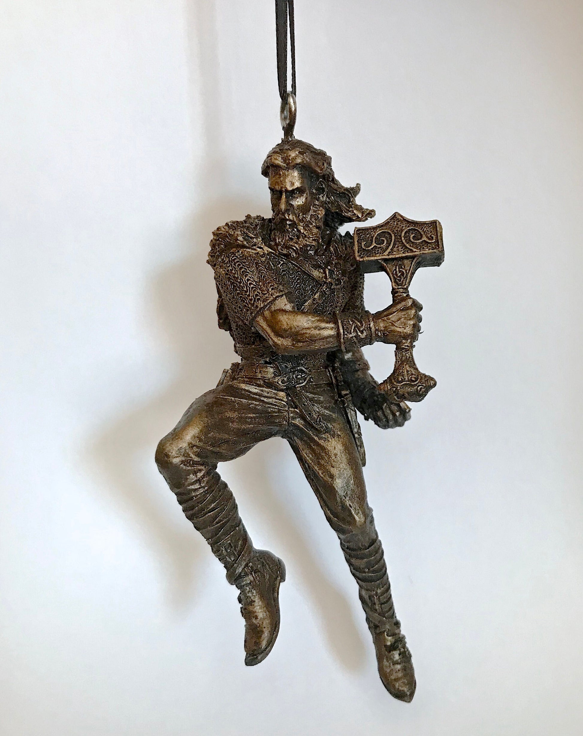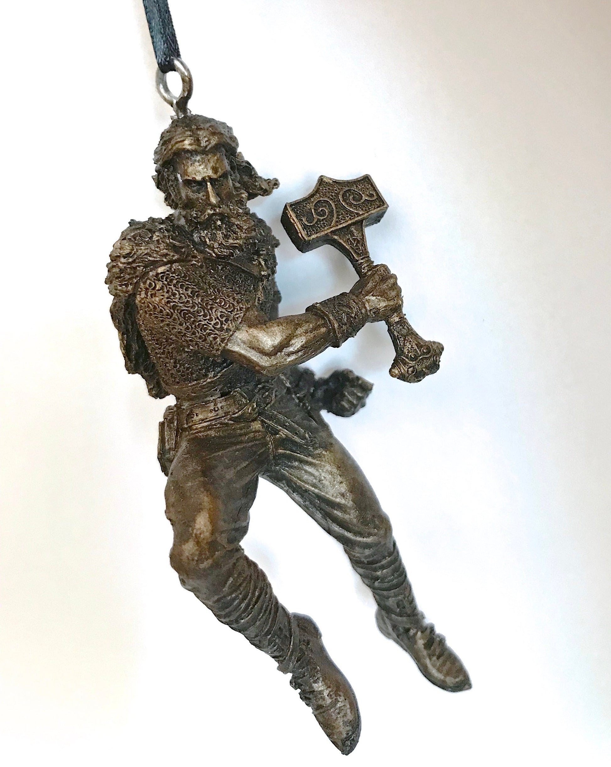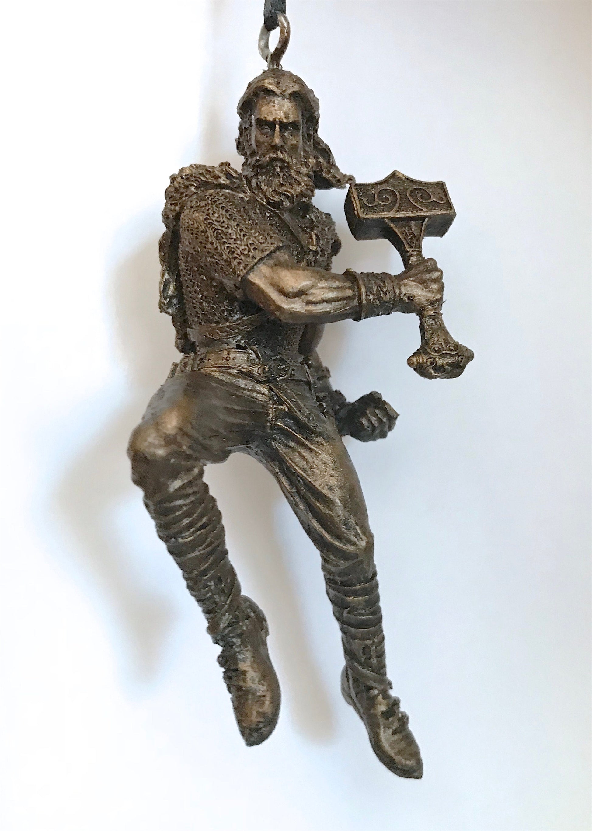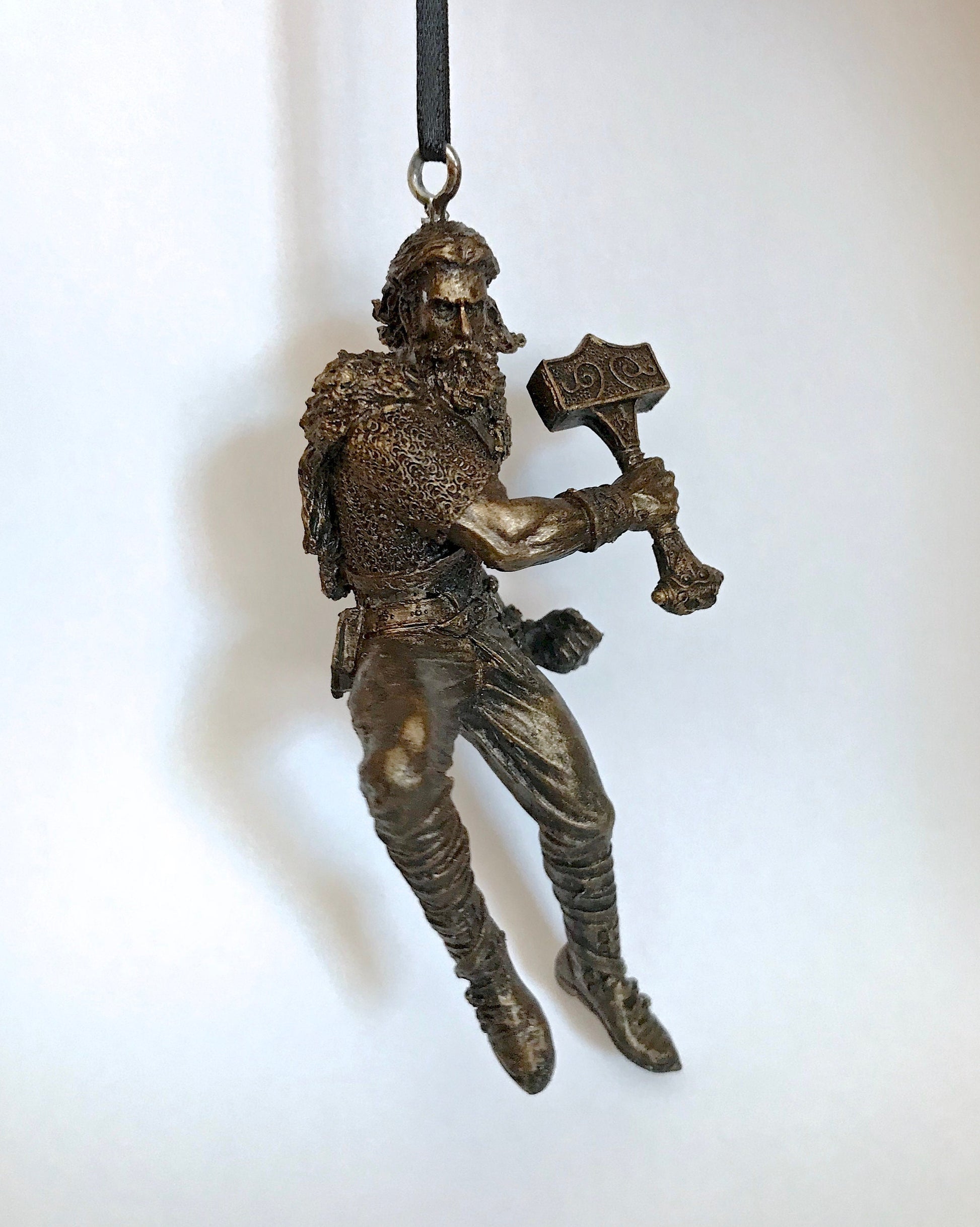 Sculpted ornament of Thor, Norse god of thunder, wielding his hammer, Mjolnir, comes with a steel loop and ribbon. 4.5" tall