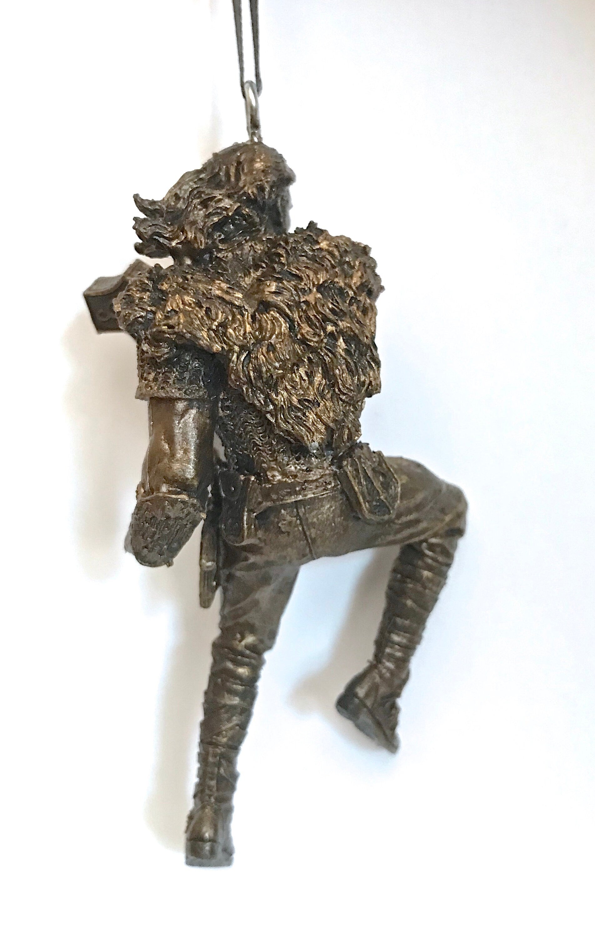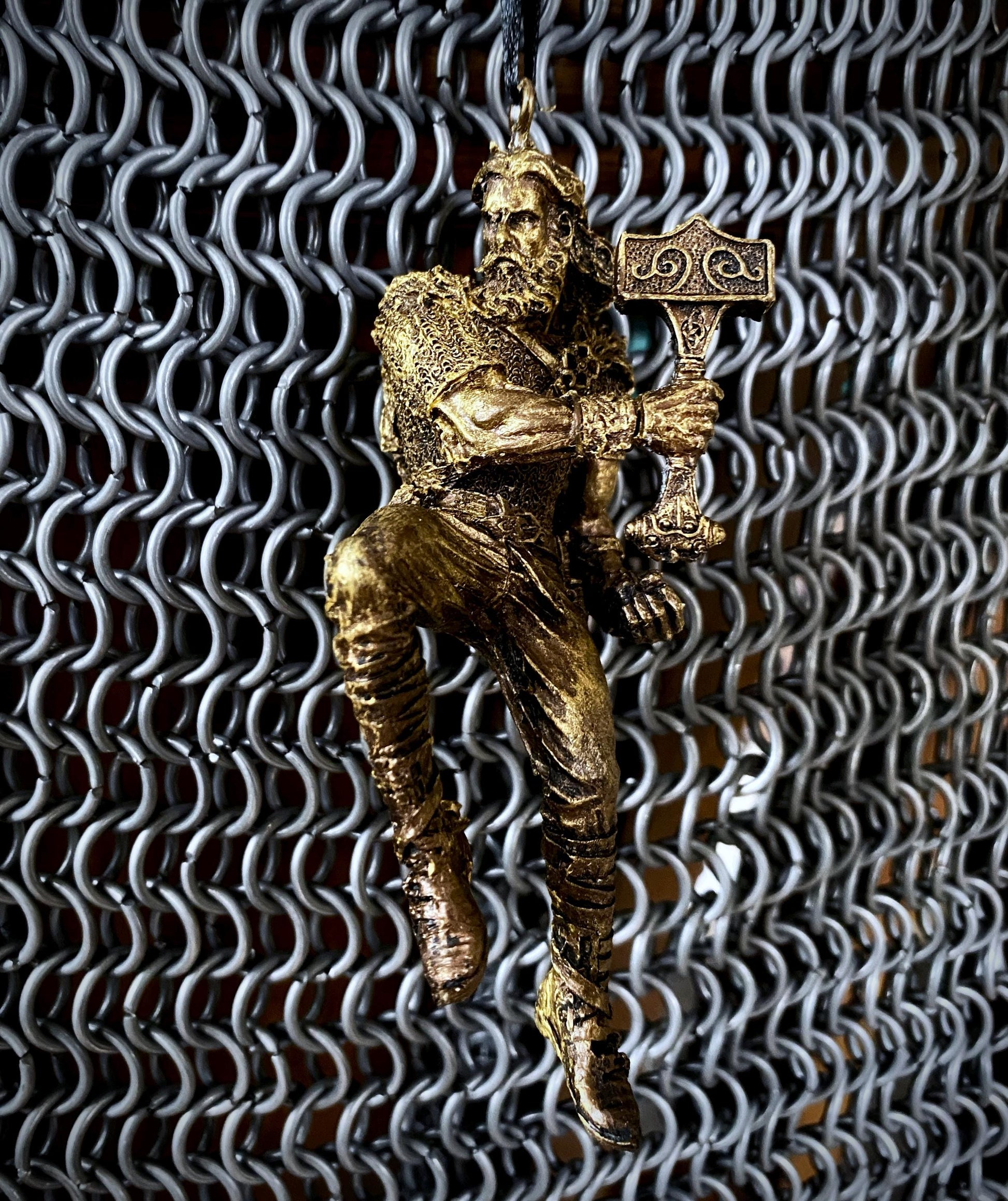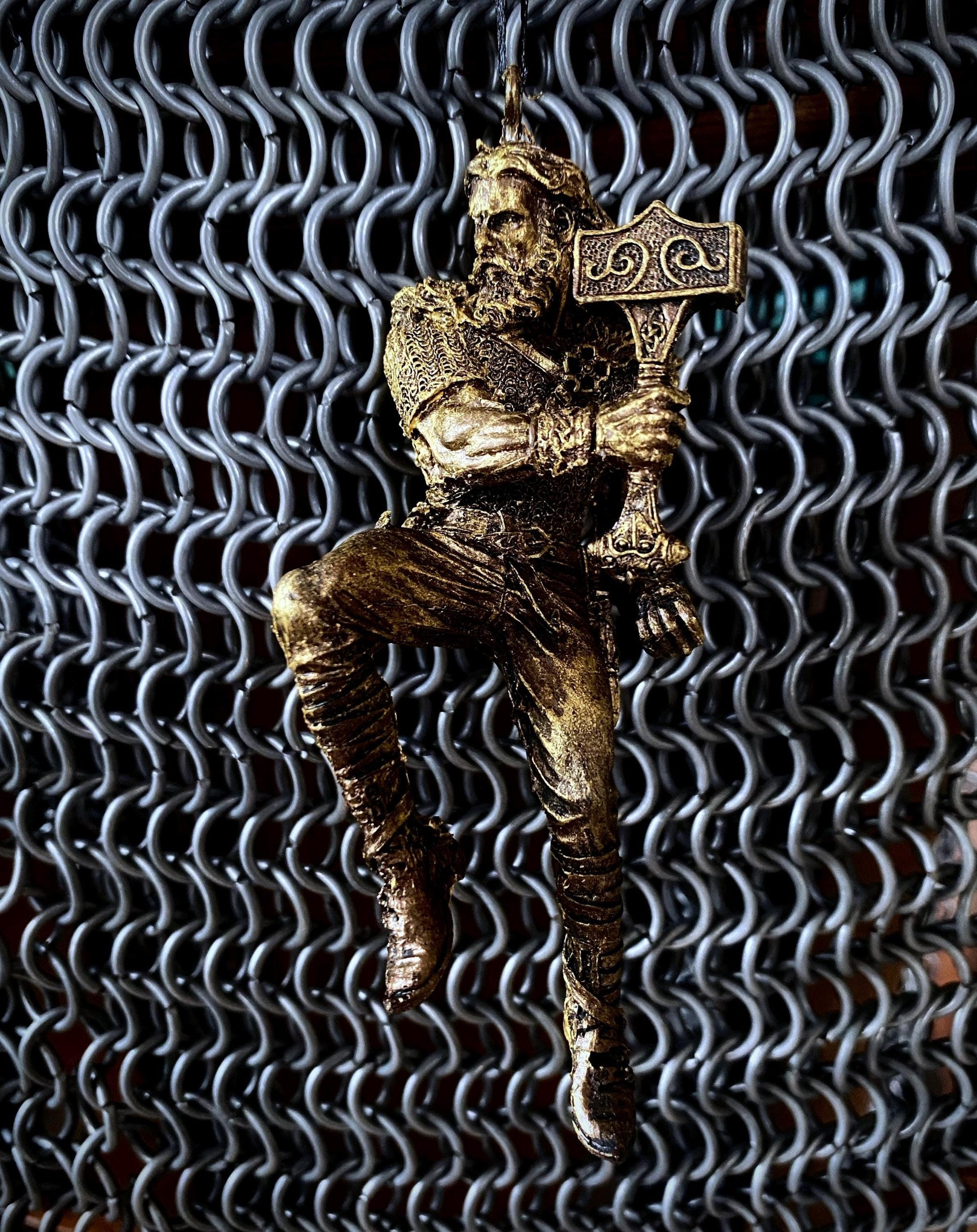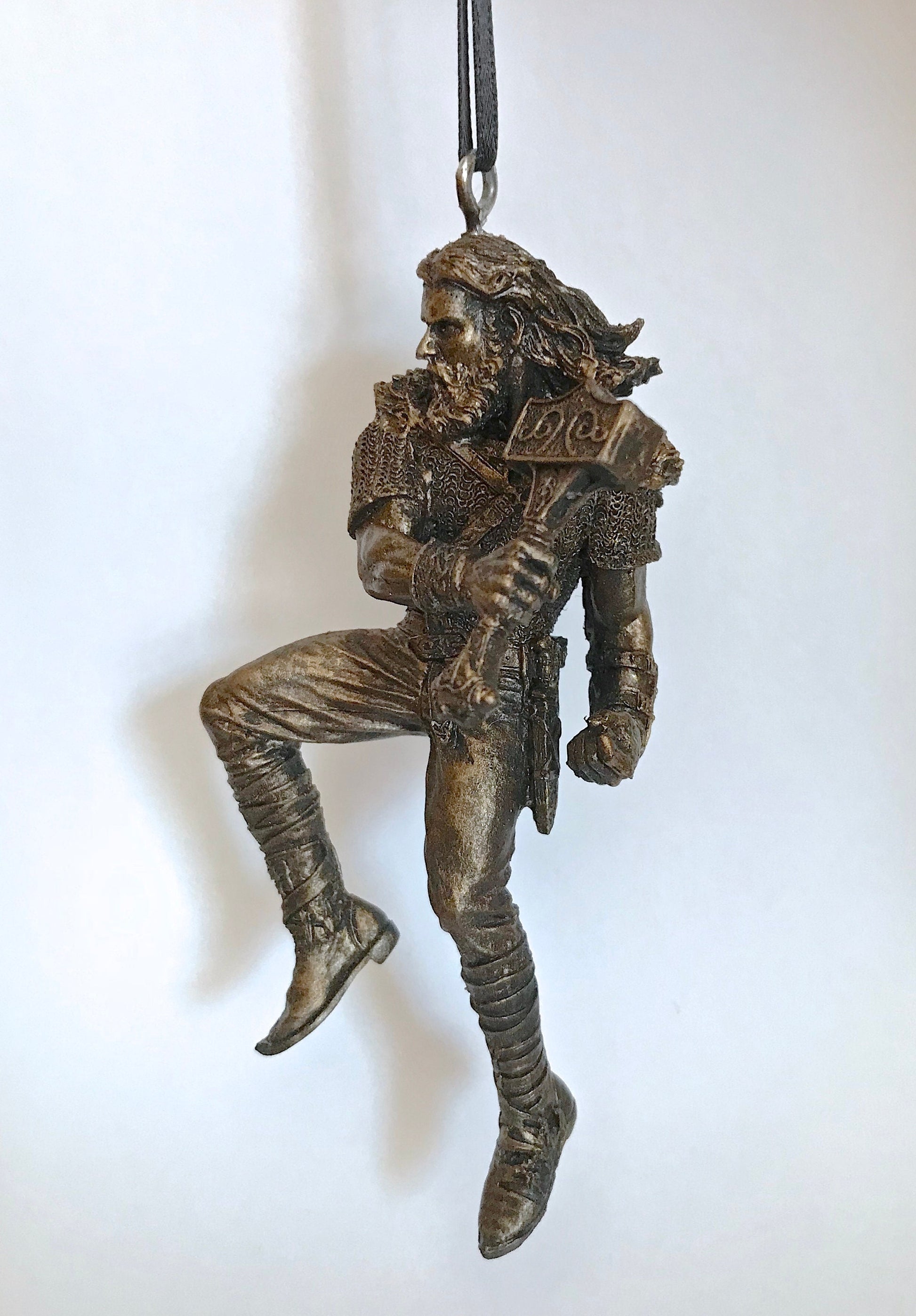 Sculpted ornament of Thor, Norse god of thunder, wielding his hammer, Mjolnir, comes with a steel loop and ribbon. 4.5" tall